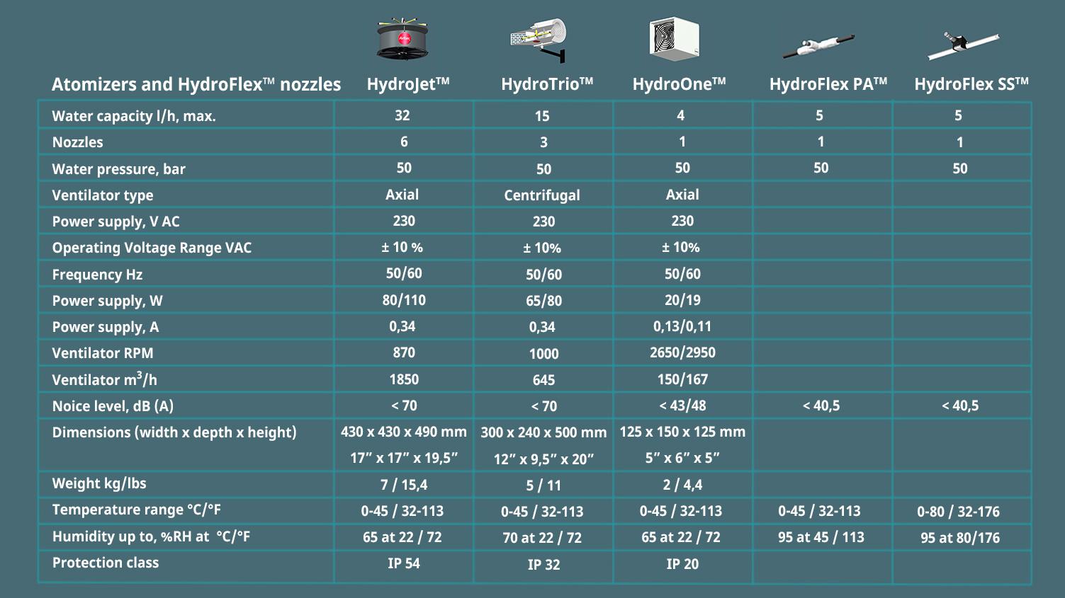 Valget af forstøvere og dyser er vigtigt, når det handler om at sikre en fuldt integreret luftbefugtningsløsning. Forstøvere og dyser fra Airtec® markedsføres under navnene HydroJet™, HydroTrio™ og HydroOne™.