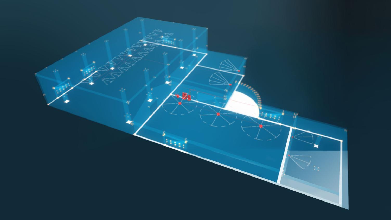 3D diagram, der viser en typisk installation. Fra kontrolenheden fordeles vandet til de forskellige zoner – her viser vi en installation med forskellige typer af forstøvere og dyser.