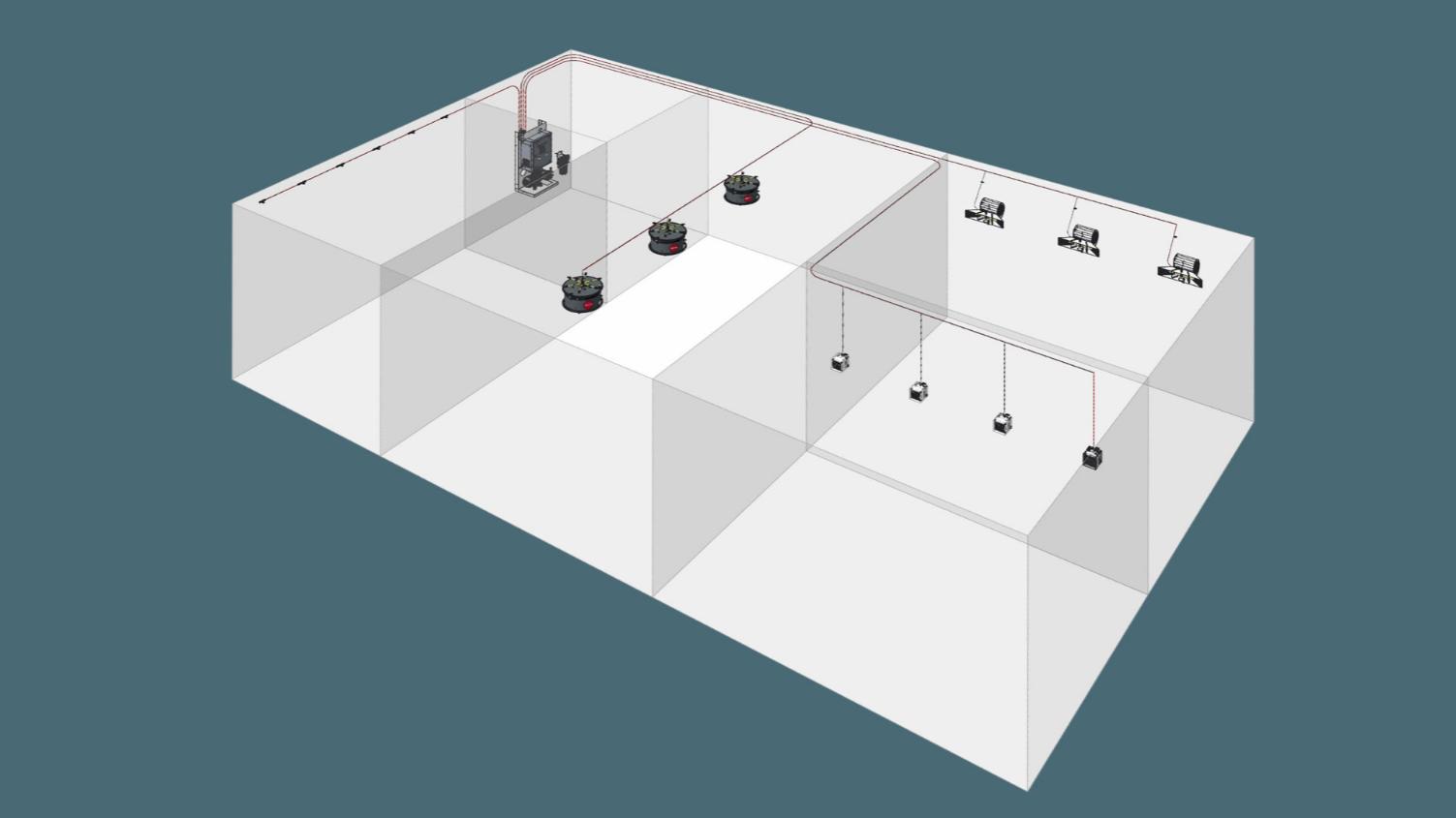 Et luftbefugtningssystem til ruminstallation fordeler vandtåge/damp til et antal zoner eller sektorer i et produktionsmiljø eller et lagerområde. Denne illustration viser, hvordan nogle forstøvere og dyser er rettet mod meget lokale varme- eller støvkilder, mens andre forsyner hele rummet med fugt.