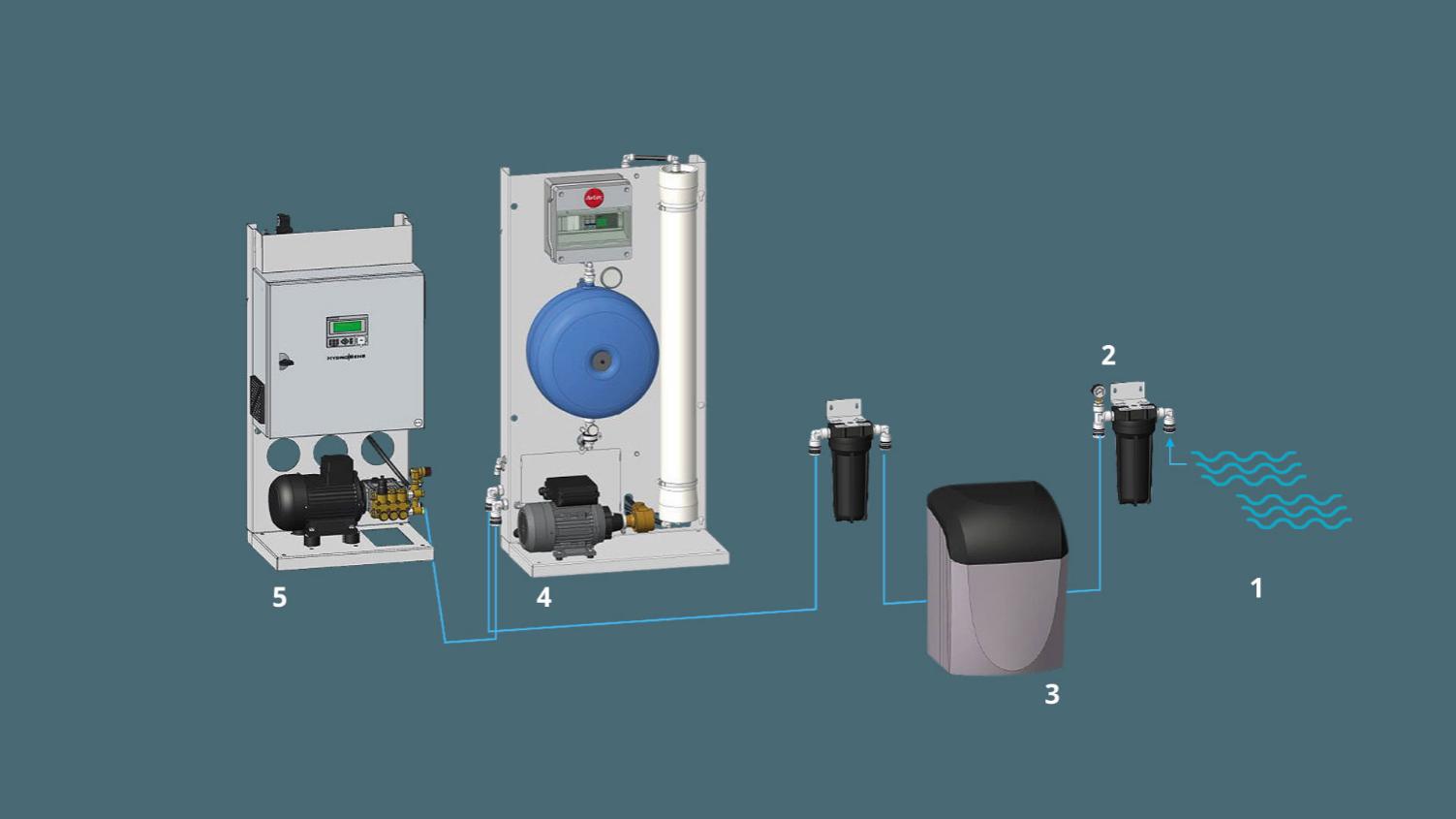 Efter det primære filter behandles vandet i en blødgøringsenhed. Enheden fjerner metalioner som f.eks. magnesium, der optræder som bikarbonator, klorforbindelser og sulfater, som kan give en række problemer med biofilm og galvanisk korrosion.