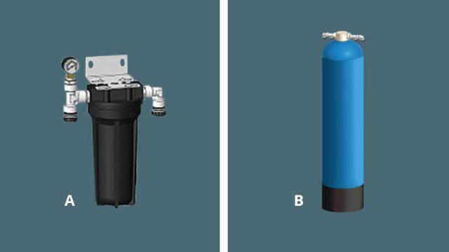 Afhængigt af den lokale vandkvalitet kan nogle installationer også omfatte et kulfilter (B), særligt når der er risiko for, at vandet har højere klorindhold end de lokale standarder tillader. På illustrationen ses kulfiltret til højre. En række lande tilsætter klor til vandet af helbredshensyn – i denne liste kan du se, hvilke lande, det drejer sig om.